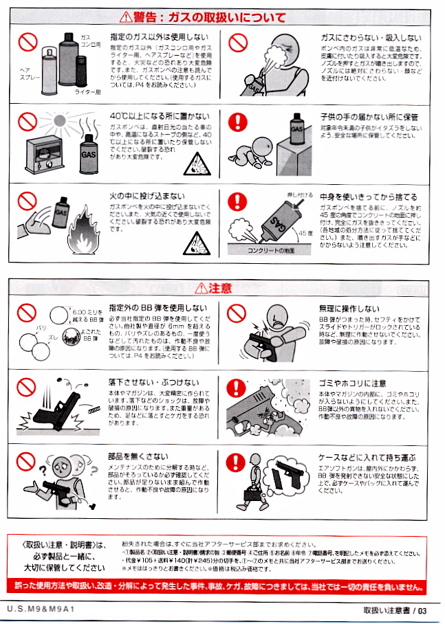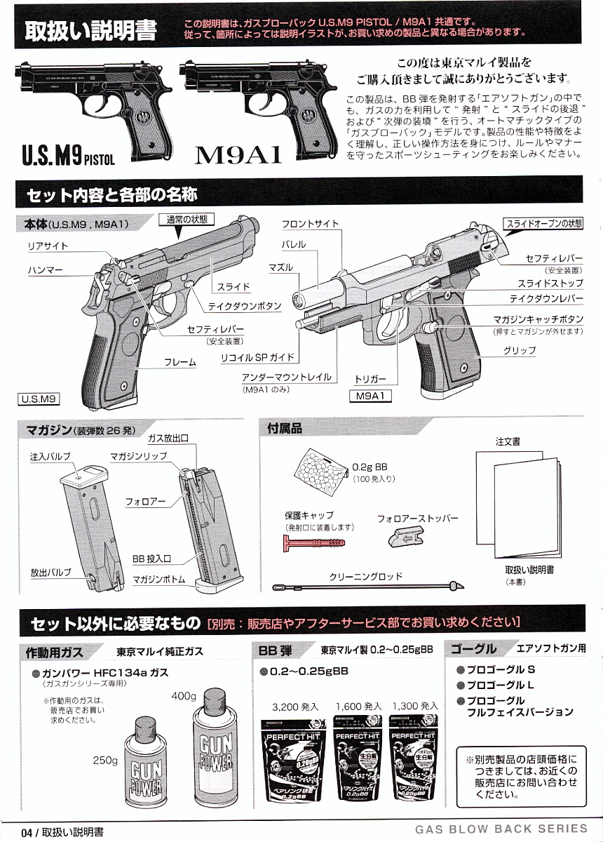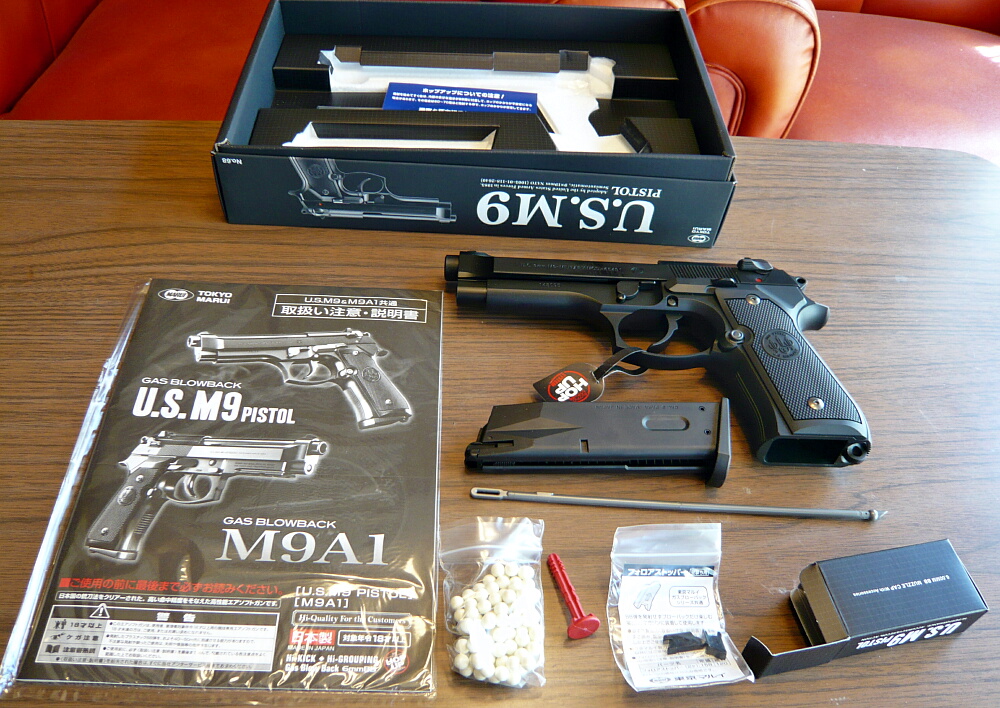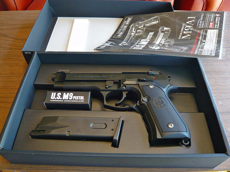 外箱。最近のトイガンではベレッタM92FSじゃなくM9の方が多いのは、まあ大人の事情。昔と違い今は遠い果ての地でこっそり売るにしても、本家銃器メーカー様にバレちゃうのですね。でもうるさいのはコマーシャルモデルで、軍用モデルはあまりうるさくはないのでM92FSの軍用モデルであるM9。