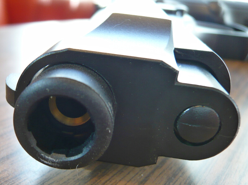 マズル部分のアップ。銃口にはライフリング表現があり、1cmほど奥に真鍮のインナーバレルが見えます。