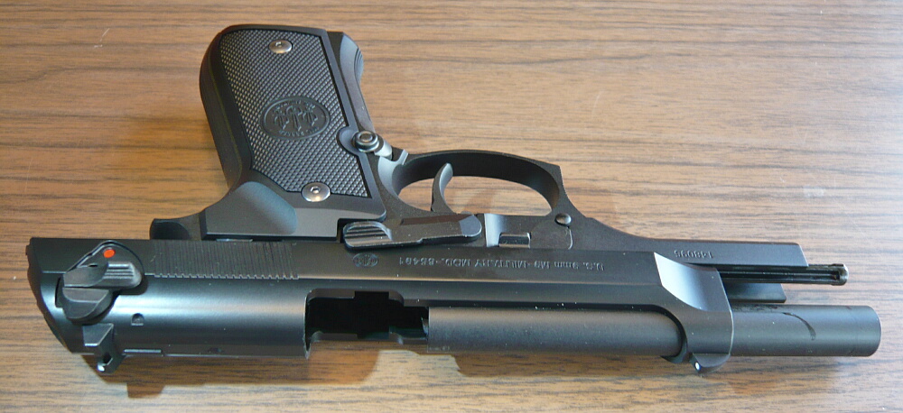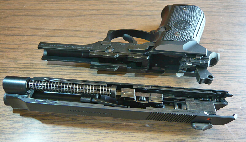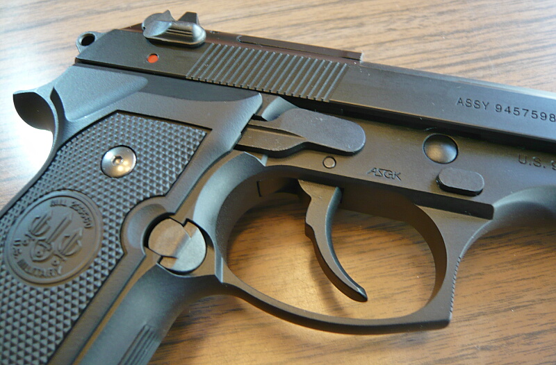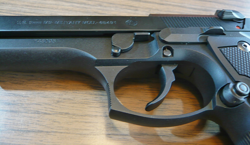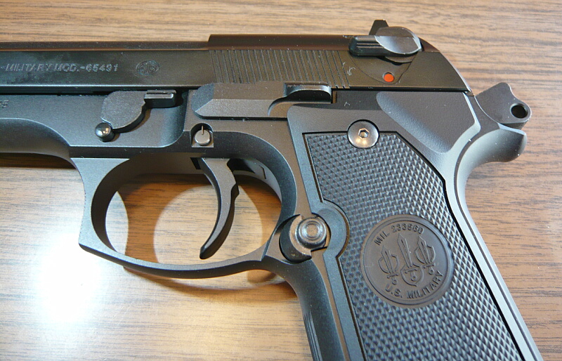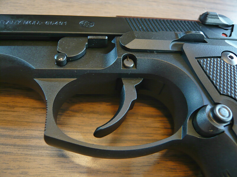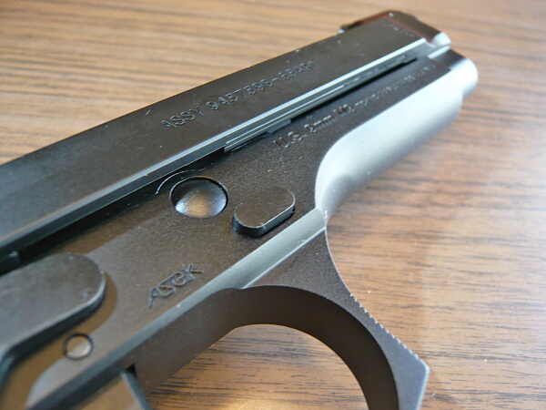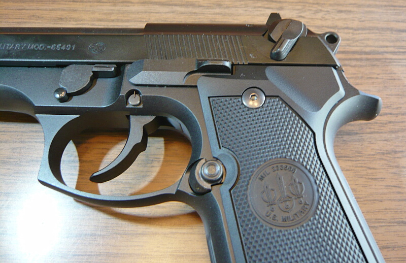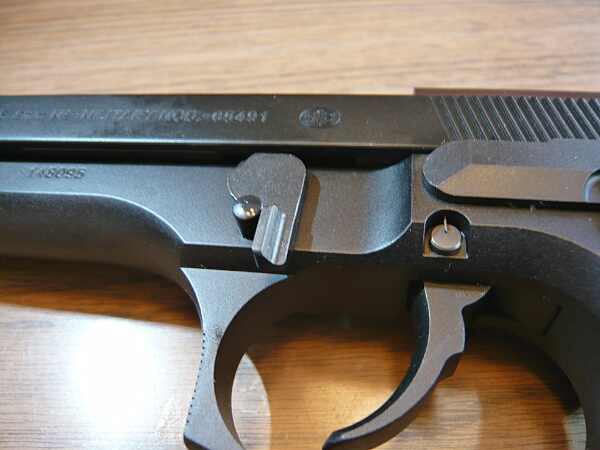 ハンマー横の、グリップパネルで覆われてちょっとだけ出ているこの円盤状のパーツ。これがM92FSの証。M9がまだM92Fベースだった頃、スライド中央部の薄くなっているところにウィークポイントがあり、そこでスライドが破断するとスライド後半が射手の顔めがけて飛んでくる危険があったため、ハンマーピンの頭を大きな円盤状にして常時スライド下面の溝に嚙合わせるように改良されました。これにより破断したスライド後半はこのハンマーピンの円盤で受け止めて止まるようになっています。この改良をされたM92FはマイナーチェンジしてM92FSとなりました。そもそも破断しないように部分的に強化された「ブリガーディアスライド」というものもありますが、あまり格好よくないのがどうにも・・・