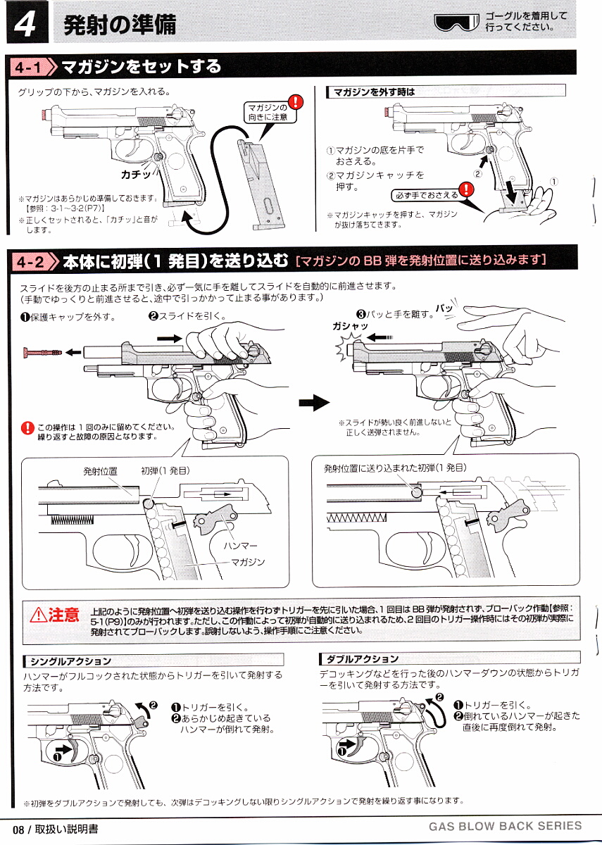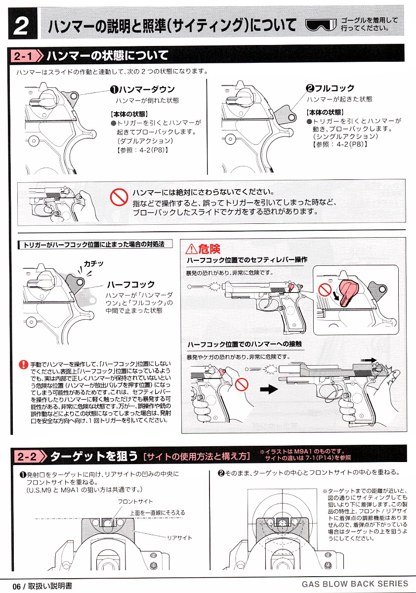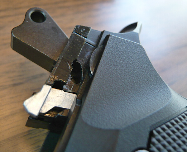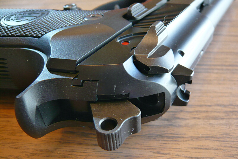 スライド後端左右にあるデコッキングレバーを下げるとハンマーが倒れます。デコッキングレバーの軸にはファイアリングピンの一部が分割して内蔵されており、レバーを下げるとファイアリングピンも45度ほど傾むくため、ハンマーが倒れてもファイアリングピン後端を叩けないため、安全にハンマーダウンさせる事ができます。実銃やモデルガンではさらにリヤサイトの前にオートマチックファイアリングピンブロック(AFPB)があるのですが、さすがにそこは省略されています。