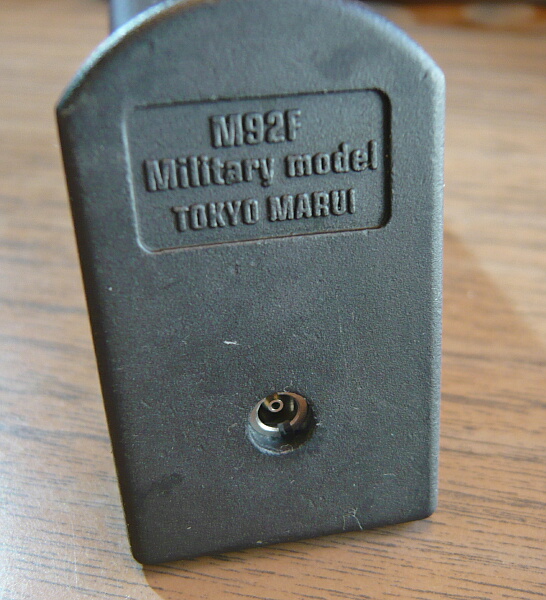 底面。マガジンバンパー底部の刻印からM92Fのものと共通である事がうかがえます。中央にはガスの注入バルブがあります。