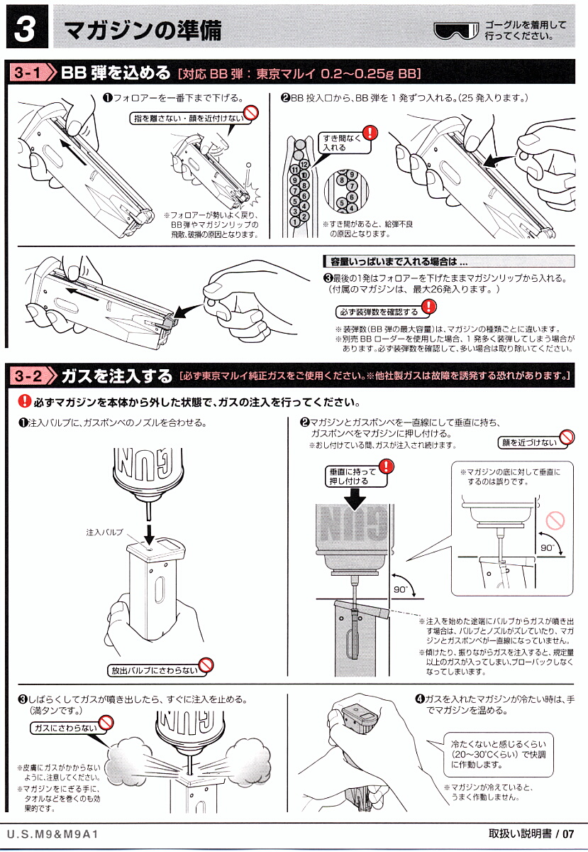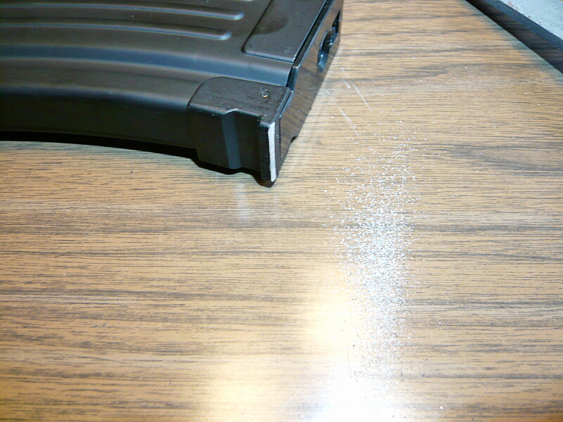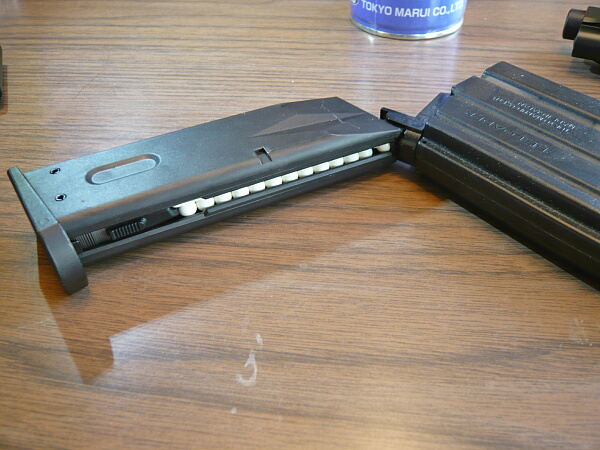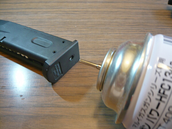ガスはマガジン底部から注入します。上写真は横になっていますが、マガジン底部を上にしてガスを注入しないと液体ガスが入って行きません。