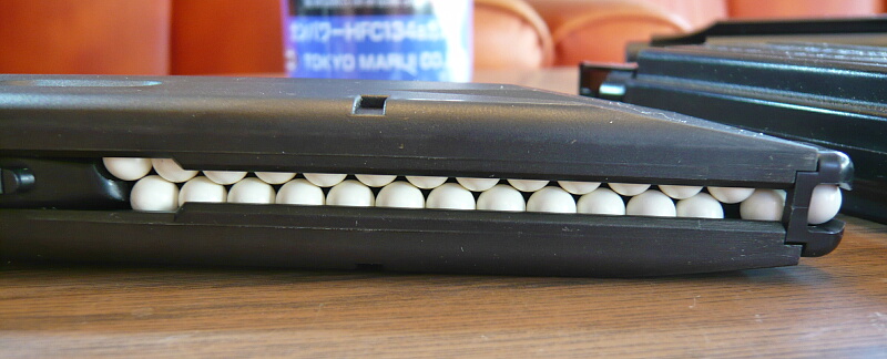 装弾数は25発。でも上からローダーでフルロードすると27発入ってしまいます。銃に挿した時にノズルなどを痛める危険があるのでなるべく25発に留めた方が良いでしょう。