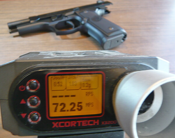 初速チェック。0.2gで72m/s前後。普通のガスブローバックハンドガンです。撃った感じも普通。トリガープルは少し長めに感じますが、ダブルアクションもシングルアクションも軽くてスムーズ。発射音は「ボカッ」という感じでリコイルは軽め。