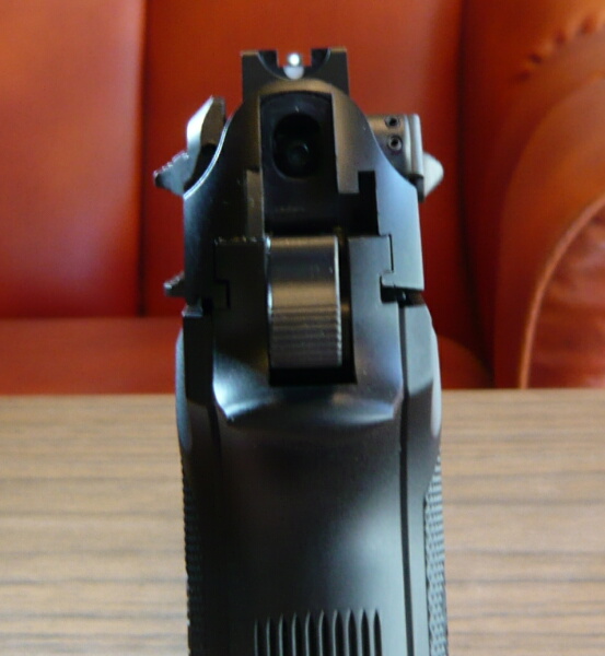 スライドを引いてホールドオープンさせたところ。旧M92Fよりノズルの後退量が増えてチャンバー内に見えにくくなっているそうです。