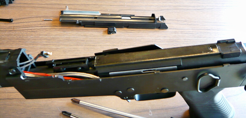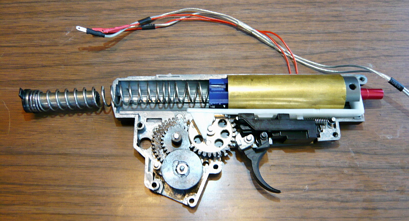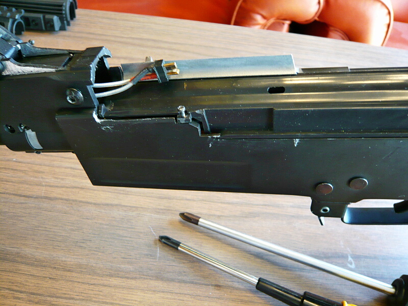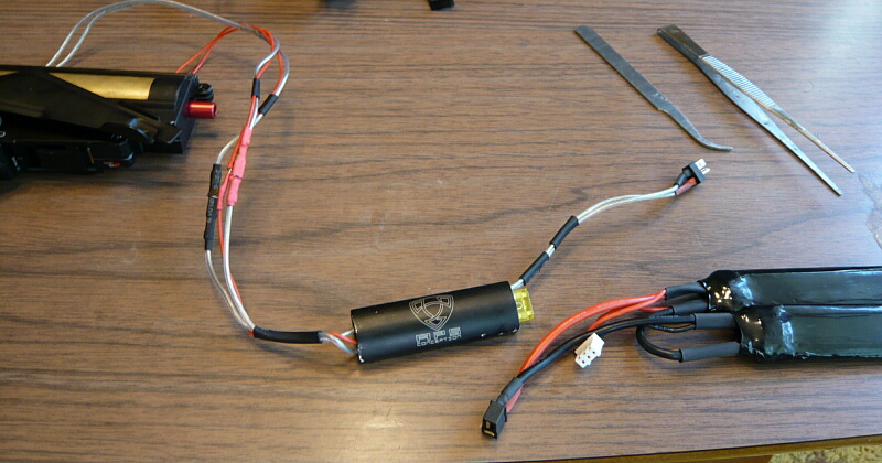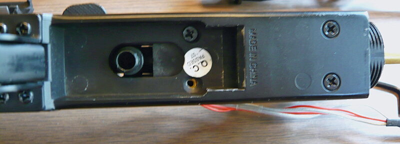 FET直後のバッテリー端子をファストン端子に換え、そこから配線を延長してトップカバー内後端からメカボックス左脇を下ってレシーバー後端から出て、ストック基部をを通りストックチューブ内に配線を通しました。ファストン端子のところ、逆接してやんの・・・(後述)