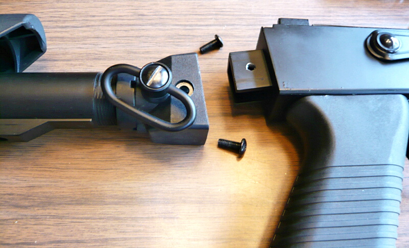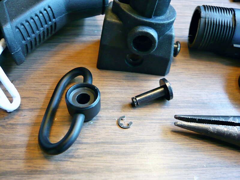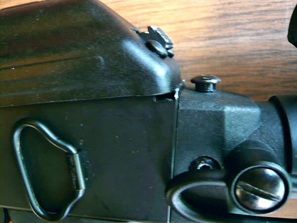 レシーバー側のスリングスイベルと被りますがあれは細くて華奢なので使いづらいためストック基部のスリングスイベルを左の穴に移設しました。右にあっても使いにくいし。