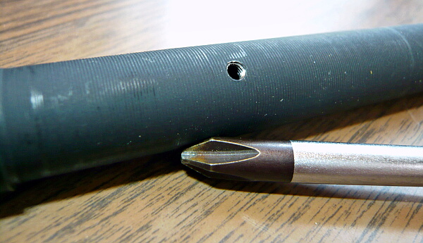 パーツをストックチューブ内に配置して覗き込んだところ。中央の穴がネジの通る穴、下にある半月状の穴が配線の通る穴となります。