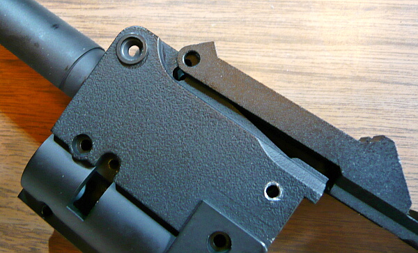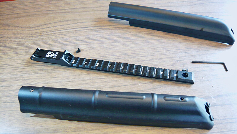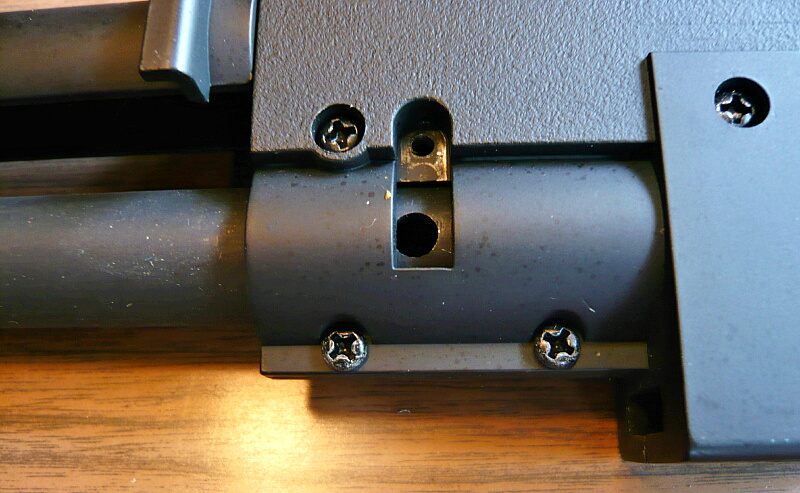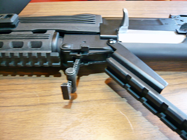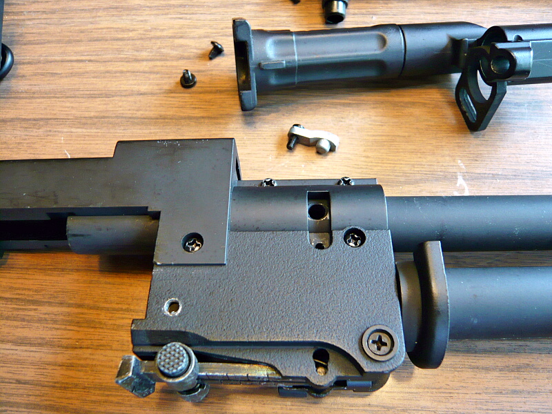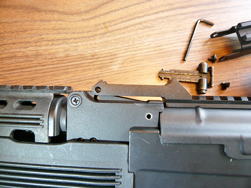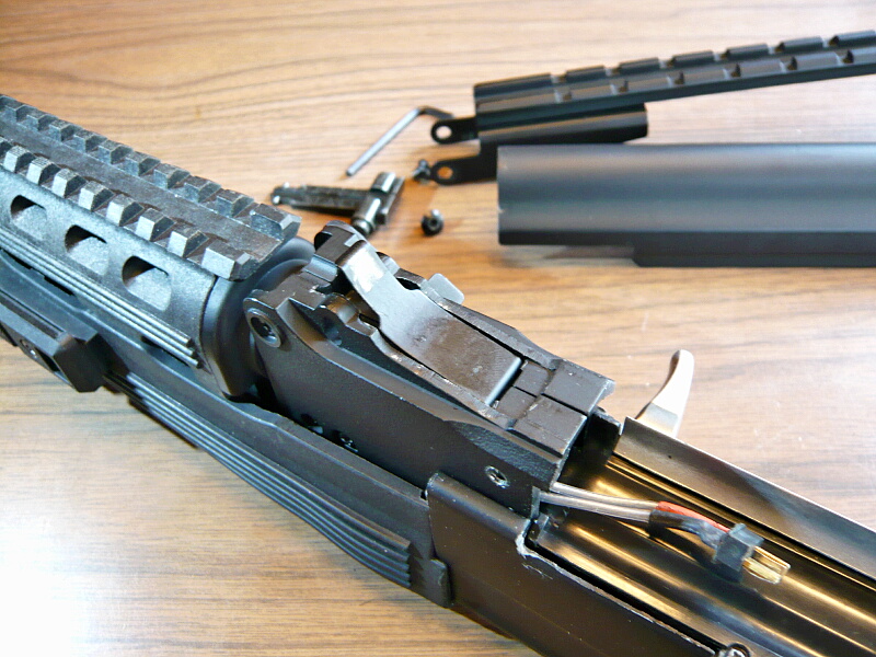 トップレイルを取り付けます。トップレイルは後端がストック付け根上面に飛び出して刺さっているネジに引っ掛けて固定されるので、レイルを後方へ引っ張ってから上に跳ね上げます。ただし先にリヤサイトを跳ね上げてからでないとリヤサイトに引っ掛かって跳ね上げられません。リヤサイトの前側の穴を利用してここを軸にトップカバーごと跳ね上げるタイプのトップレイルに換えてしまいたい気分。