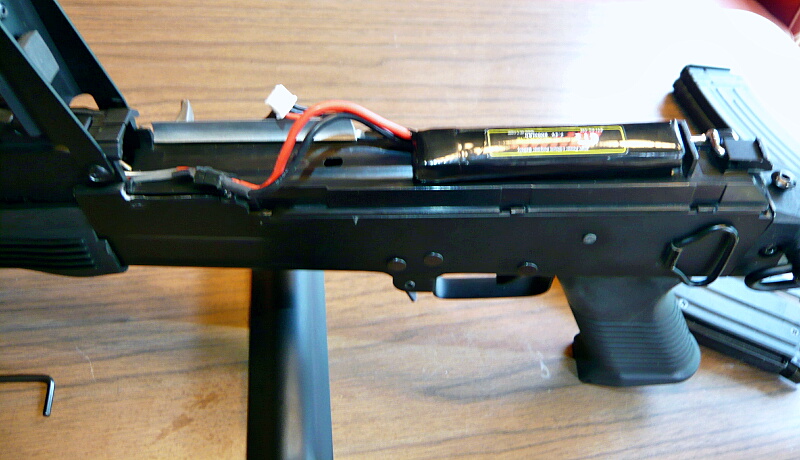 長らく撃ってもいないので動作チェックも兼ねてバッテリ―をセット。トップカバー内は太さ方向にシビアで案外適合バッテリ―が限られており、持ってるバッテリーではマルイのAKバッテリー以外では800mAhの小さなリポバッテリ―しか入りません。