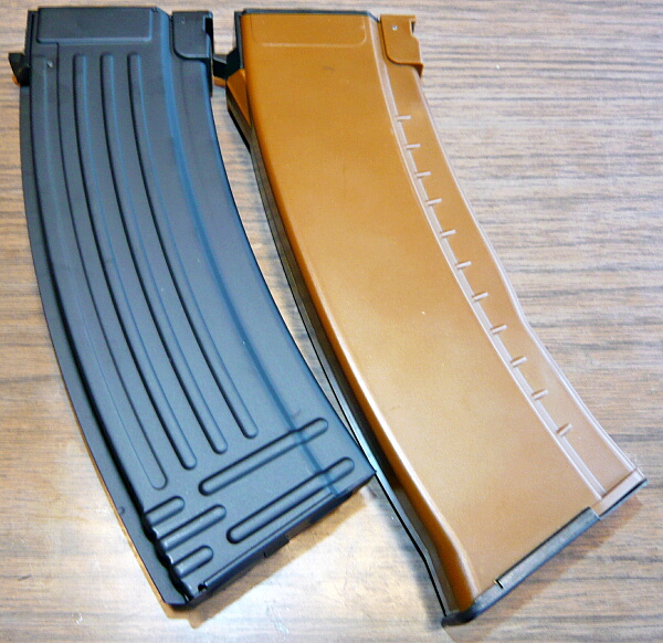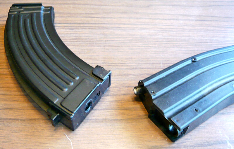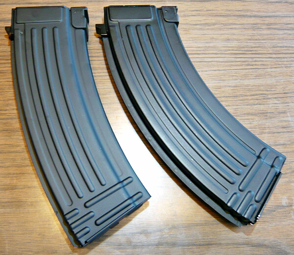 左が74スチールマガジン、右はマルイのAK47用ノーマルマガジン。74マグは使用弾が5.45mm×39、AK47/AKM用は7.62mm×39で、薬莢が円錐のように先細りが強い7.62mm用は曲率の強いマガジンとなっています。一方5.45mmの方は曲率が浅くM16/M4系用のマガジンのような印象を受けます。