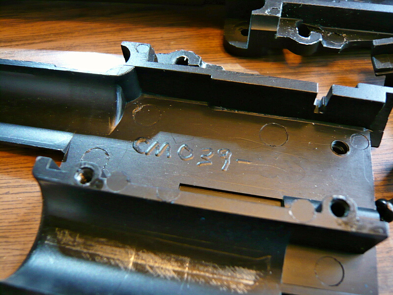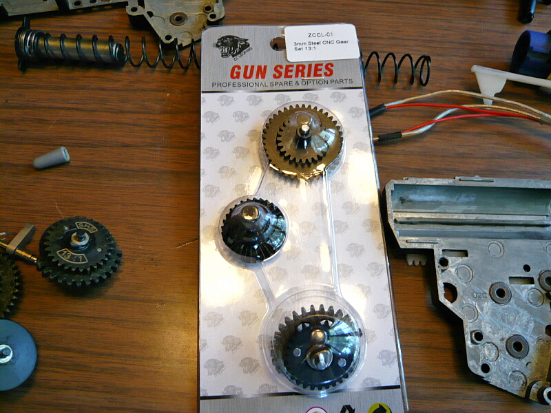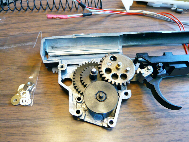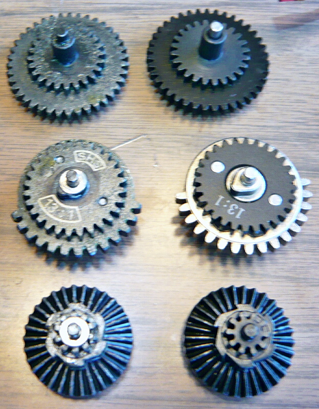 左がこの銃に入れてたSHSの13:1ギヤ、右はZC Leopardの13:1ギヤ。SHSの方は私がいじり始めの頃に間違ったセクターカットをしたのでギヤ枚数が少なくなっています。色や所々微妙なディテールに差異はありますが、軸の太さの差は軸受けの相性と直結するので重要なところ。ZC Leopardの方がかなり太く見えます。