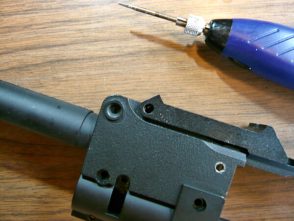 リヤサイト基部のヒンジとなる穴を後方と上方に向けて若干削り拡げ、その左右も銀色が露出してしまいますがスムーズに開閉するように表面のシボを落とす程度に削りました。トップカバー前端の干渉部分2mmほどを削ってヒンジ開閉もちゃんとできるようにします。
