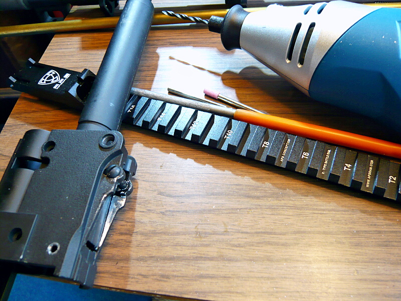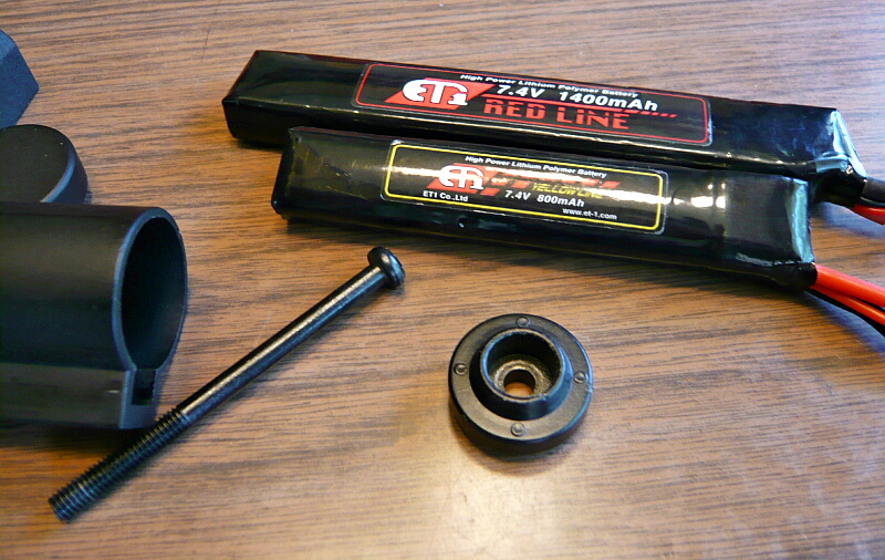 さてまだやる事があります。バッテリーが小さいものしか入らないのが不満なのでストックチューブ内に収める改造を行います。元々部分的に対応しているので、ストックチューブ固定パーツを換えるのが簡単ですが、売切れてたので加工します。