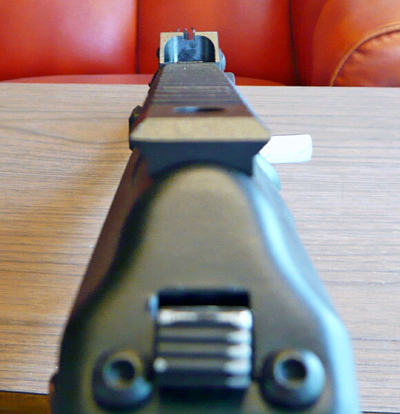 アイアンサイトの見晴らし。個人的にはA1のようなリヤサイトのノッチの左右にホワイトドットがあるやつの方が慣れてて見やすいかな・・・