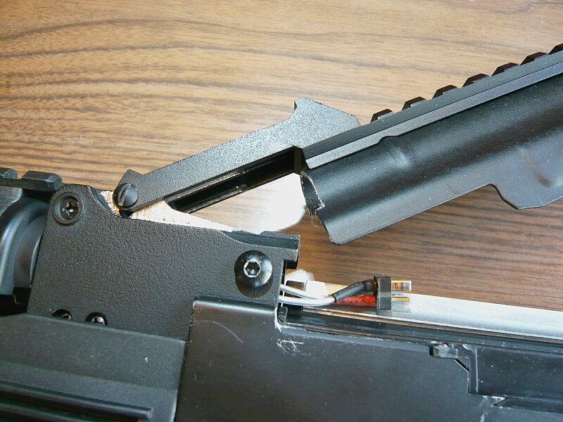 配線をリヤサイト下のトンネルからガスパイプ部分へ通し、FET本体をガスパイプ部に配置させました。アウターバレル下に配置するとコネクター配線がリヤサイト下のトンネルに隠れて出てこなくなるのでこの位置が精一杯。