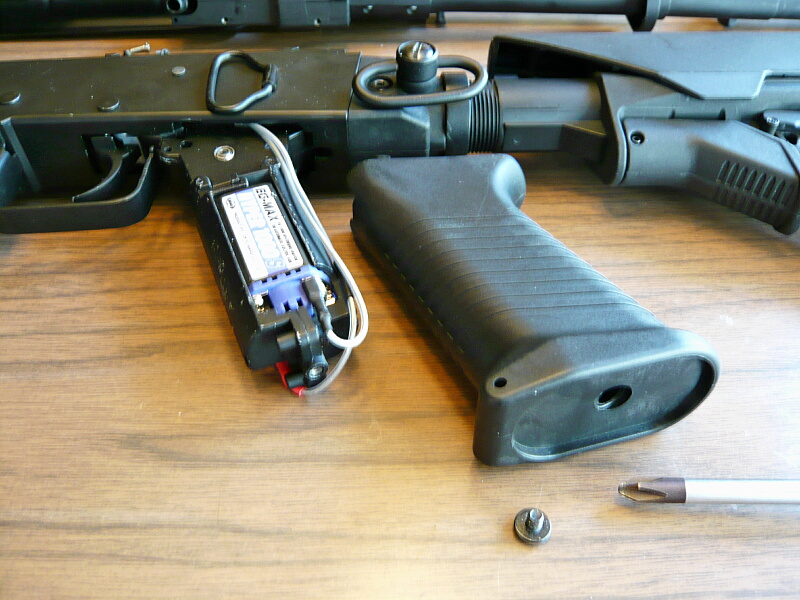 グリップ底部のネジを外してグリップを外します。この銃ではモーターがマルイEG1000ショートに換装済み。