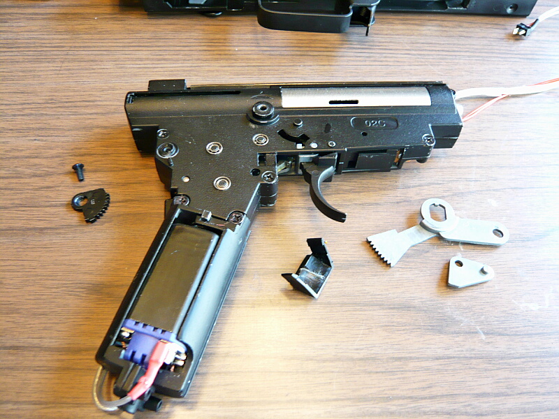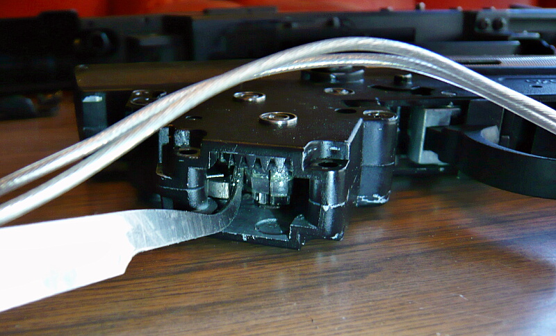 モーターの刺さっていた部分から逆転防止ラッチの解放を行います。引っ掛ける細い工具が必要なのですが、そういう工具は売っていないような・・・自作するか、用を成すもので代用しましょう。メカボックスによっては右側に穴が開いてて細い棒を突っ込んで解放できるものや、S&TのタボールやG36のように銃自体に解放機能があるものもあります。