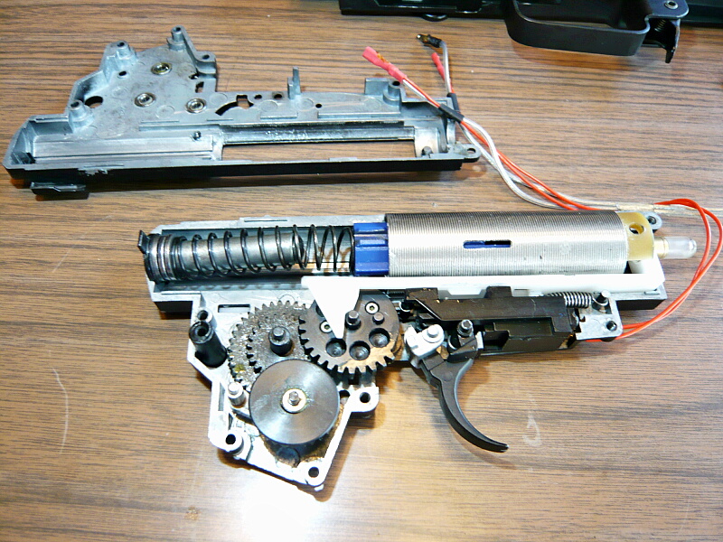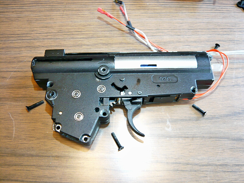 最後にスプリングをライラクスのMS90(他の銃(この銃かも?)に一旦入れてまた他のに換えたもの)に換え、メカボックスを閉じます。ライラクスのスプリングは長いのでちょっとメカボックスを閉じるのに苦労が増えてしまいます・・・