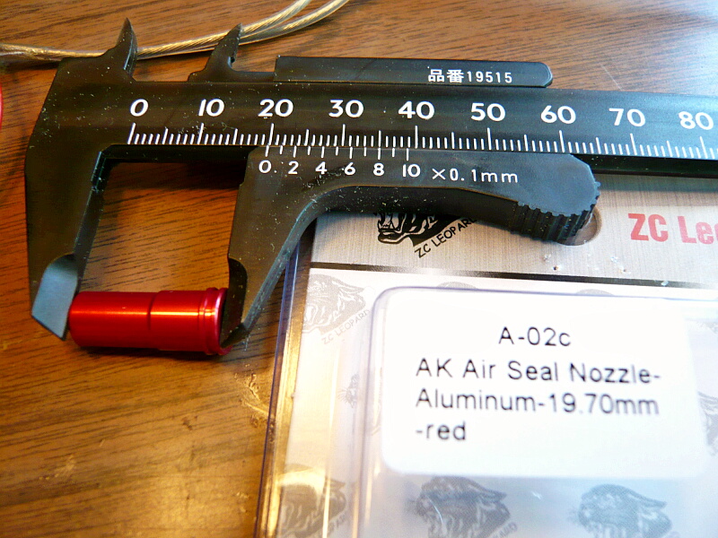 ZC LeopardのAK用アルミノズル。19.70mmとありますが計ってみると19.8mmくらい。0.1mmくらいタペットプレートの調子で変動する範囲な気がするし、このノギスがどれほど正確かも怪しいので気にしないでおこう。