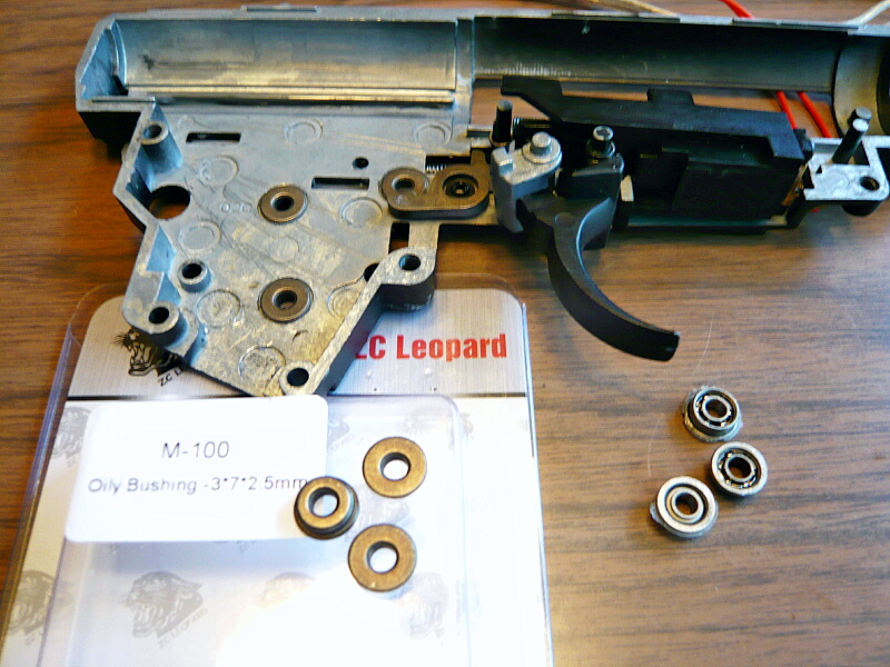このメカボックスの軸受けは元々十字型の溝のあるメタル軸受けが付いていましたがSHSのベアリング軸受けに換えていました。これは特に不具合とかもなくスムーズだし悪く無かったのですが、ギヤを換える場合軸穴の相性が発生する場合があるので、ギヤと同じメーカーの軸受けの方が間違いが無い、という事でここも交換しておきます。ただ、ベアリング軸受けは強度がー安物は精度がーみたいに言われていたり、何となく素人臭い(私は素人です!!)感じがしたのであえてオイルレスメタルにしてみました。オイルレスメタルというのは潤滑成分を金属に混ぜ込まれている軸受け用の金属。銅または鉄に黒鉛や硫化モリブデンなどの固体潤滑剤を混入して構成されているもので主にメンテフリー化を目的として使用する素材です。そのため軸受けへの注油頻度が少なくてすむ、ぶっちゃけしなくてもいいくらいになりますが、頻繁に開けてメンテするような人にはほとんどメリットが無いともいえます。(ライラクスの「シンタードアロイ軸受け」は多孔質の焼結金属で油分を保持しやすくしている「含油軸受」で狭義では別のものですが、これもそっちのものかもしれません・・・)