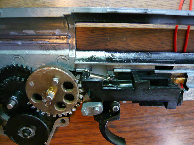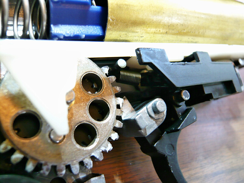 トリガースイッチのオス側を後方へ引き戻し、スプリングを掛け直します。やれやれ。