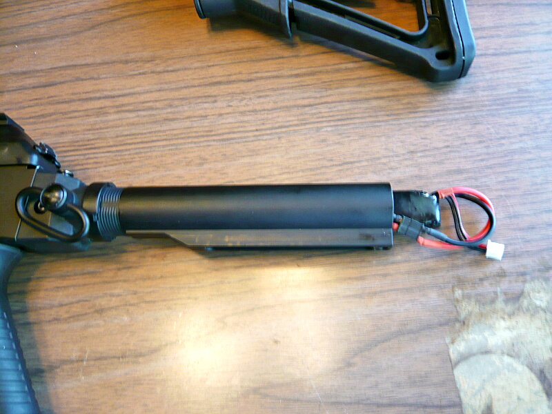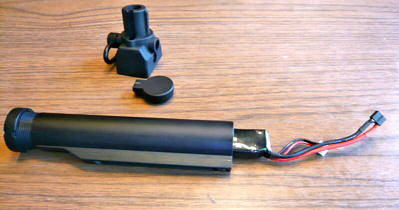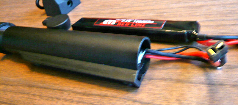800mAhのリポバッテリーはすっぽり入っているように見えますが、配線までは納まりません。1400mAhだとかなりはみ出します。もっとも、ストックを縮めきらなければいいだけなので、太さ方向に少し大きい分、持っているバッテリーの内で使えるものが増えます。