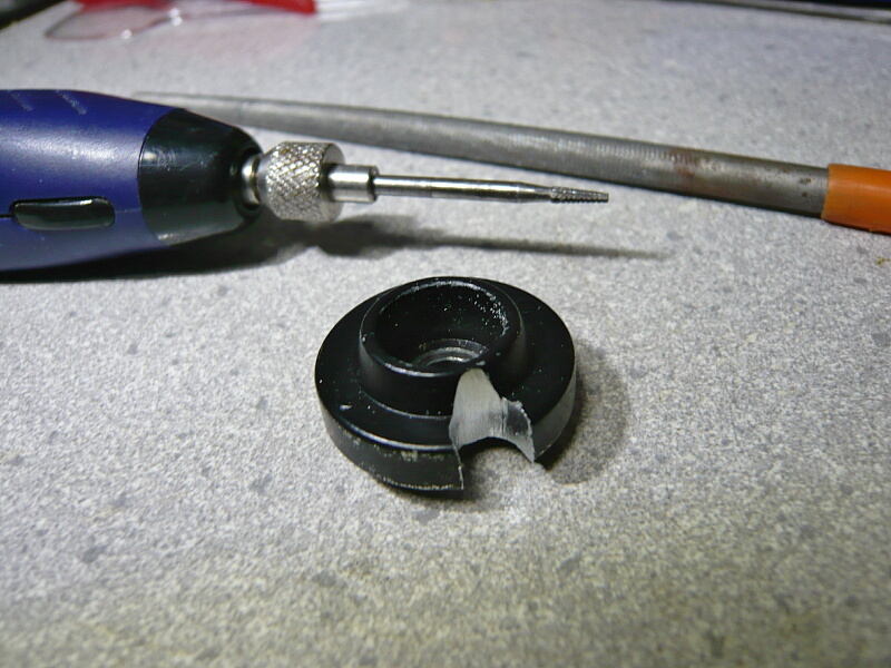 これくらい削れは配線が通せるだろうか。このパーツは亜鉛合金製のようなので割と削りやすいです。