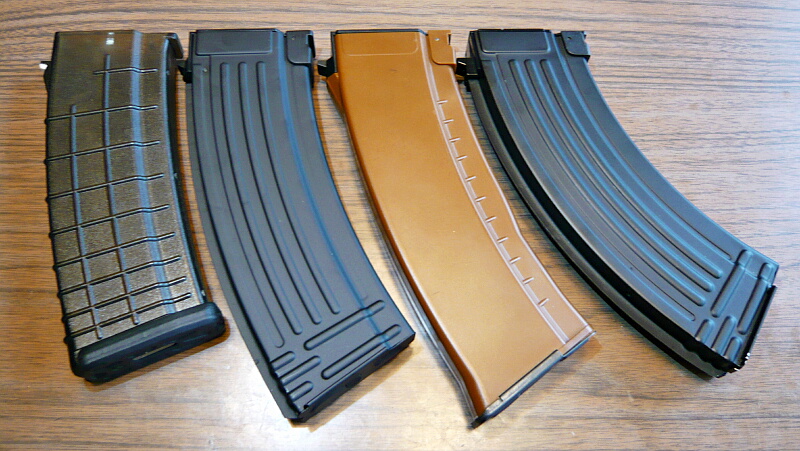 スタンダード電動AK用マガジン4種。一番左のはマグプルPTSのAK Pマグ。絶版品ですがよく似たものがブルガリアAKマガジンとして売られています。ブルガリアのアーセナルARシリーズ用のマガジンなので使用弾は5.56mm×45のためAK74用よりも曲率は浅くなっています。