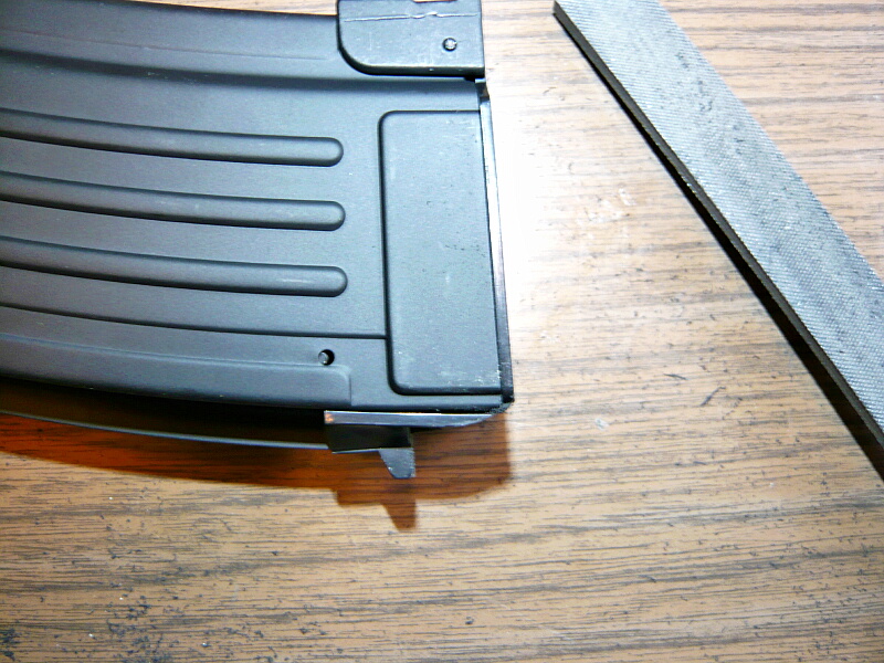 マガジンキャッチの掛かるところより上を斜めにゴリゴリ削ります。マルイ次世代AKS74Uに入るまで削ります。