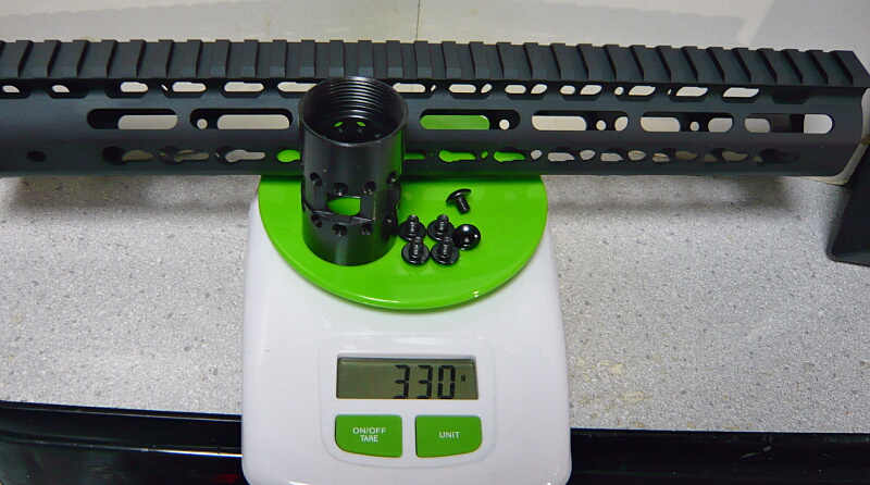 バレルナットとネジ込みでは330g。4面レイルのRASなんかよりずっと軽いハズです。
