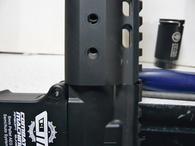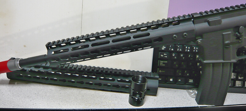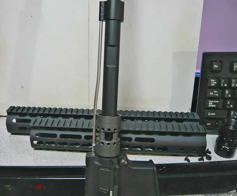 次に外した11インチハンドガードは9インチのKeyModハンドガードを取り付けているG&G CM16に移設します。ノベスケハイダーなせいか付け根の細い部分がどうも弱弱しい。30mm径のハイダーなのでハンドガード内に少し潜らせた方がカッコイイに違いない、というわけでして。