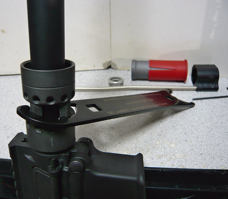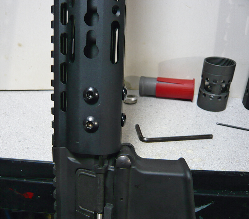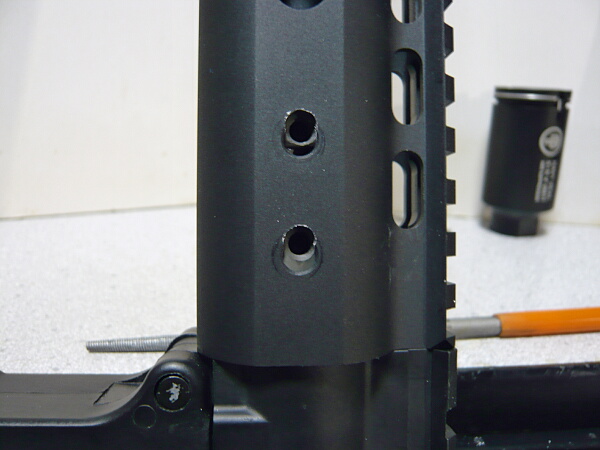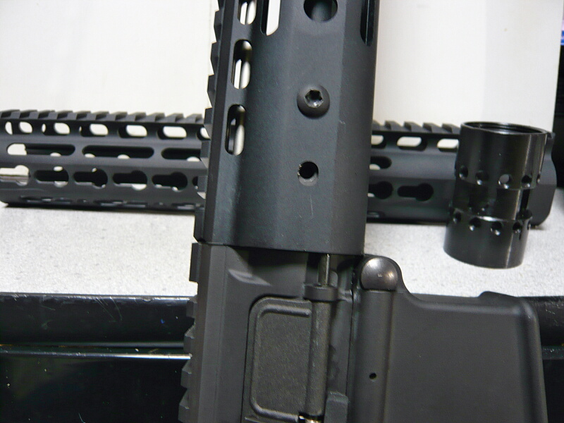 KeyModハンドガードを差し込み、穴位置を合わせます。レンチでバレルナットを締めたり緩めたりしつつレイルがアッパーレシーバー上のレイルとズレない位置を探ります。