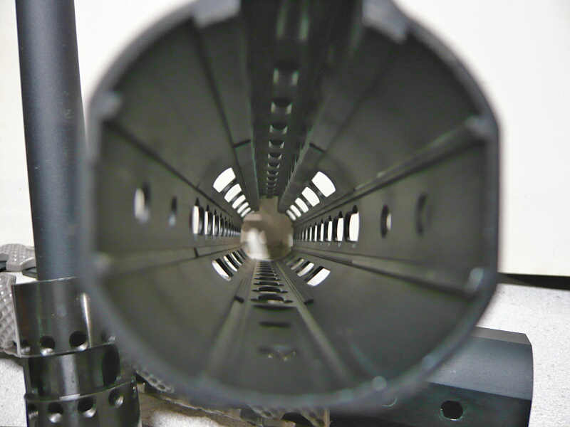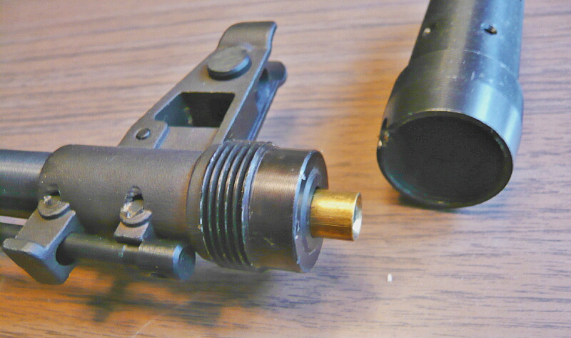 ハイダーはAK系の共通として根元のボタンをおしこみながら回して外すようになっています。ネジは24mmの正ネジとなっています。マルイのAKS74Uもハイダーの取り付けは24mmでしたが、これは実銃のAK74系(5.45mm×39)は全部24mmで、47やAKMなど7.62mm×39の銃は14mmだからなのだそうです。ハイダーを外すと真鍮製のインナーバレル前端が露出します。