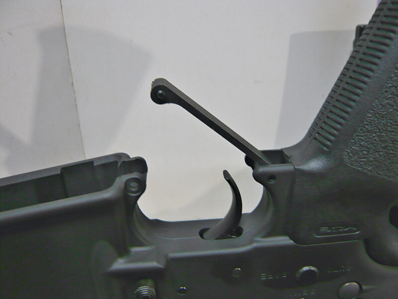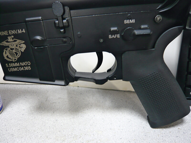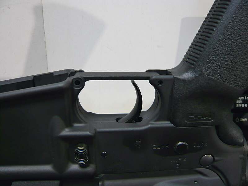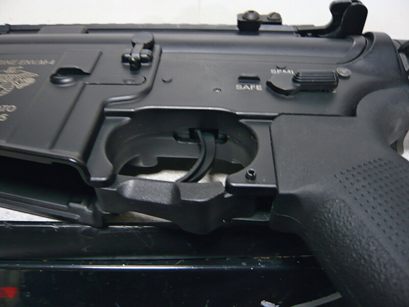 マルイM4A1MWSのトリガーガード。標準的な真っ直ぐなただの板状のトリガーガードが付いています。