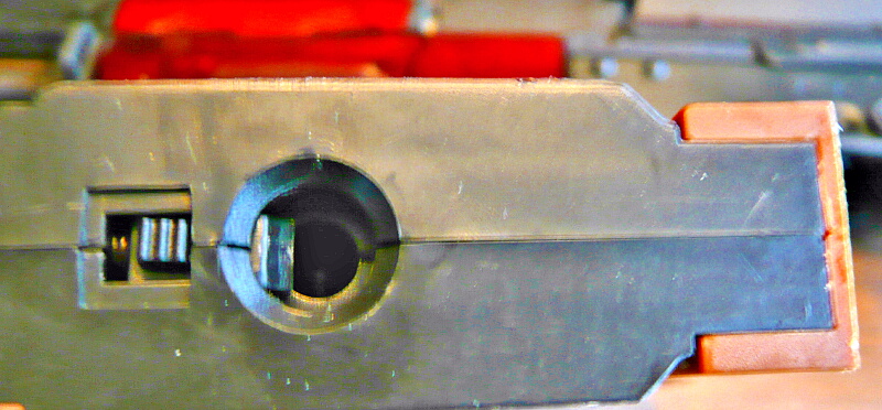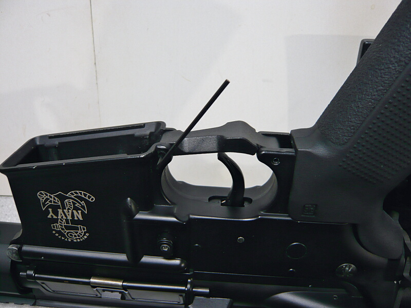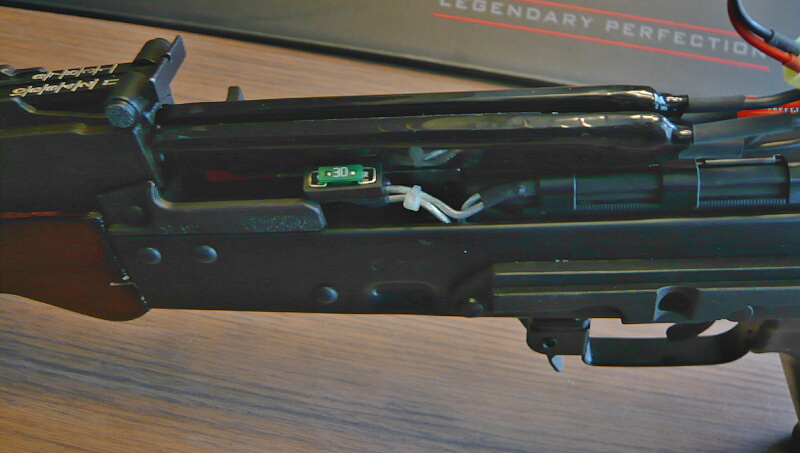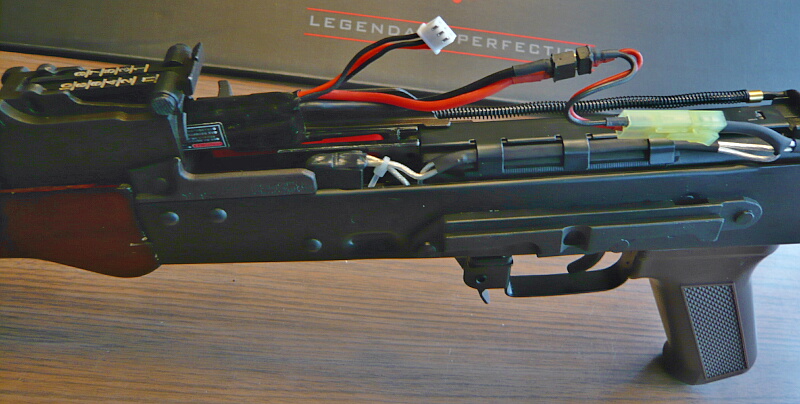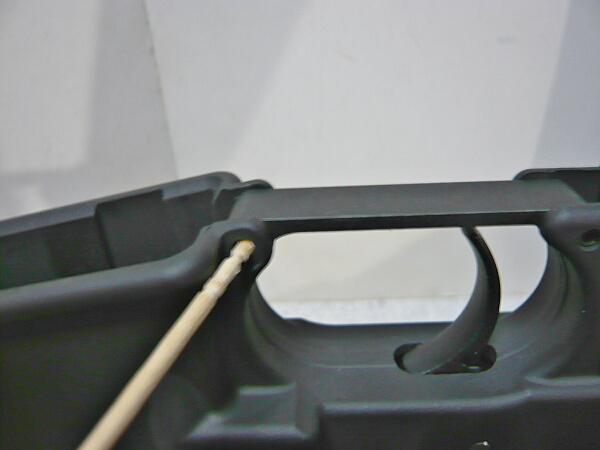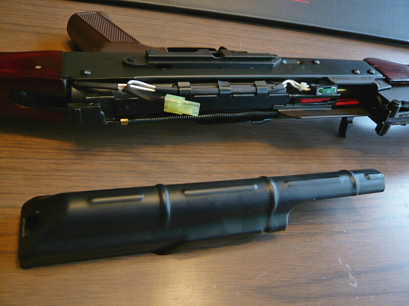 マガジンポート内。E&LのAKはLCTと構成が似ていて、あちらと同様にマガジンポート内が大きくえぐれているためマガジン挿入時に差し込み過ぎてうまくマガジンを装着させられない欠点があります。それを解消させるためのマグウェルスペーサーが標準装備されています。(マガジンポート内のE&Lのロゴが付いたパネルがそれ)