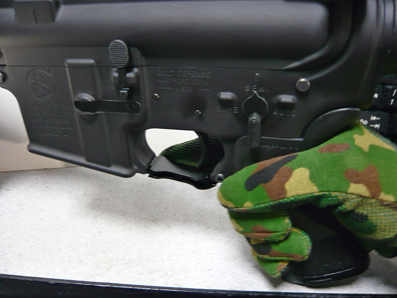 トリガーガードを動かすと前側が外れます。元々厚手の手袋をはめたままでもトリガー前に指を入れやすいように、ここが可動式となっています。でも今はトリガーガードを下に湾曲させた形状のものに替えてしまえばこんな操作をしなくともトリガー前は広くなります。