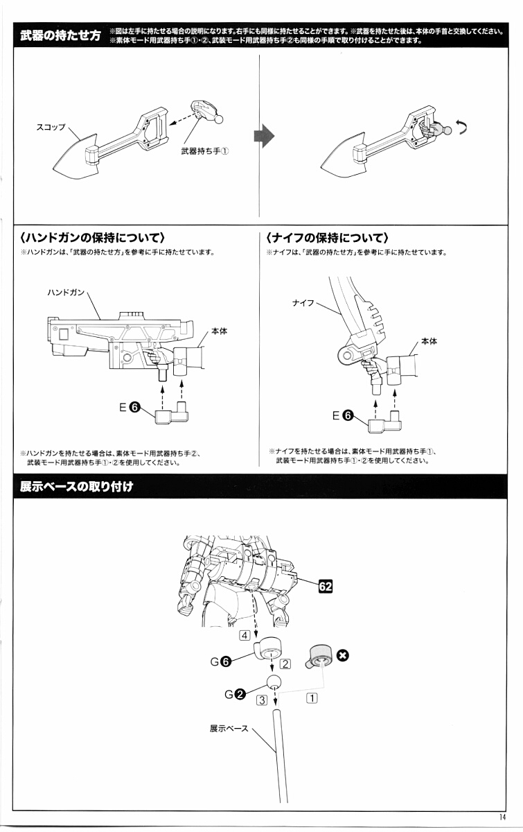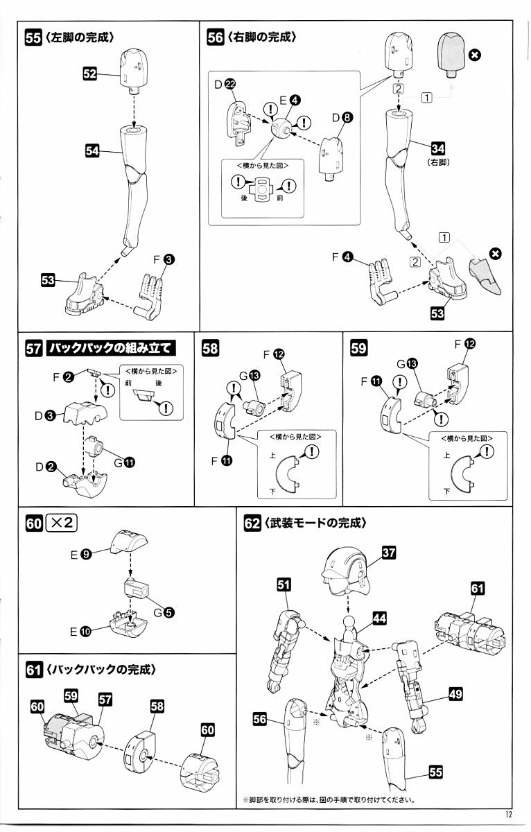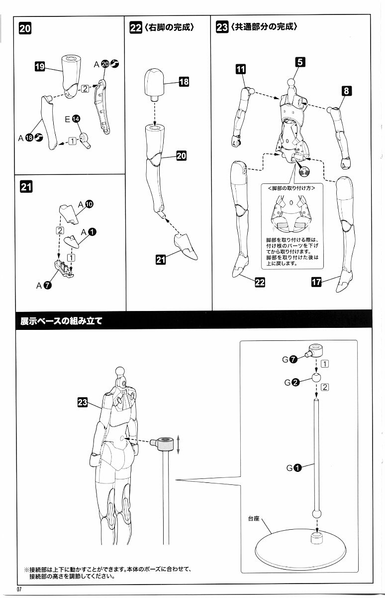 武装状態と素体状態とで共用するのは首と股関節のアセンブリと胸と腹を除く胴体とパンツ、両足の太ももから下~足首まで。