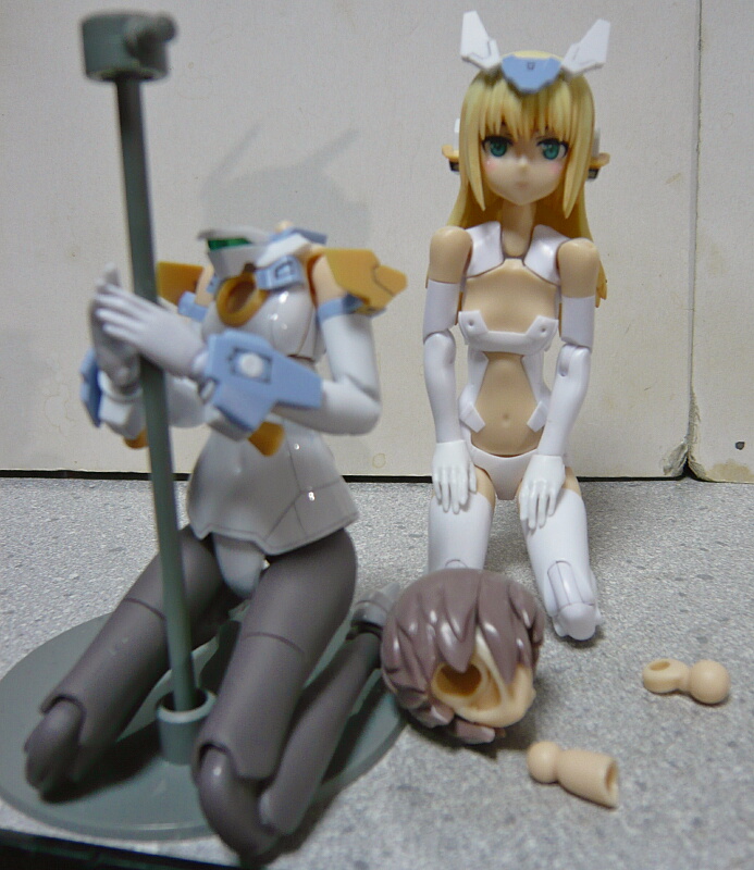 ボールジョイントを換装すればメガミデバイスの素体にFAGの頭を載せる事ができます。ただしその逆(FAGの体にメガミの頭)はできません。もっともランナーの入っていたビニール袋を切り出してFAGのボールジョイントに被せるなどして太らせてやれば載るでしょうか。