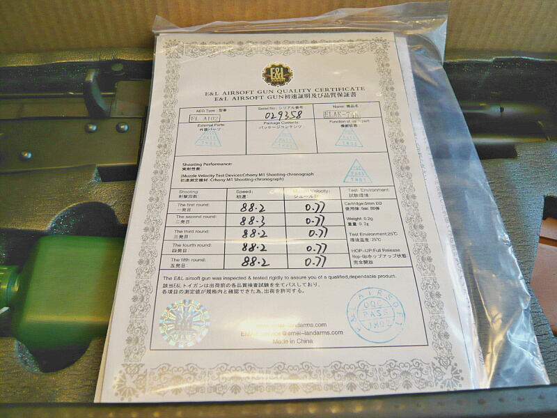 E&Lの初速証明書。まずこれが無いと日本国内に輸入できないので、海外製トイガンには必ず付いてきます。