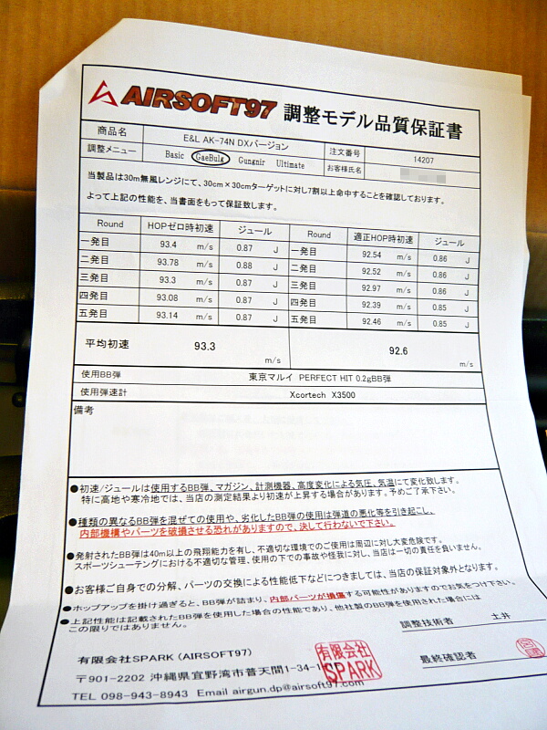 店で調整してもらったのでその証明書。基本的な調整だけだと結局自分で開けてモーター換えたりギヤ換えたりとまたいじり壊すだろうから、それは店側であらかじめ手を入れてもらいました。全部やってもらうコースはちょっと予算オーバーだしお座敷で大して撃たないのでそこまではいいか、って感じで。