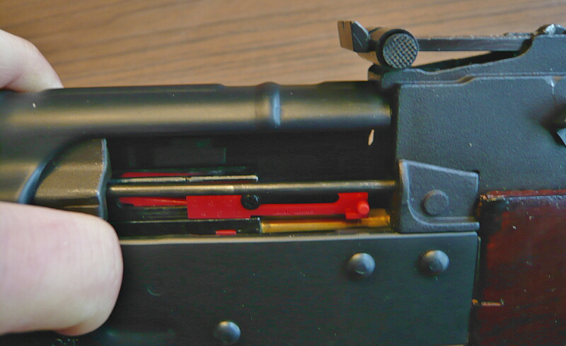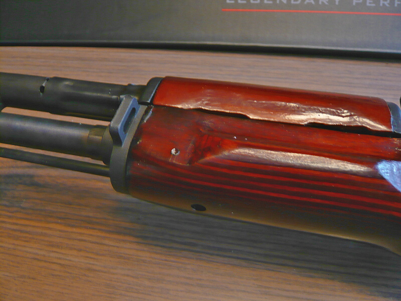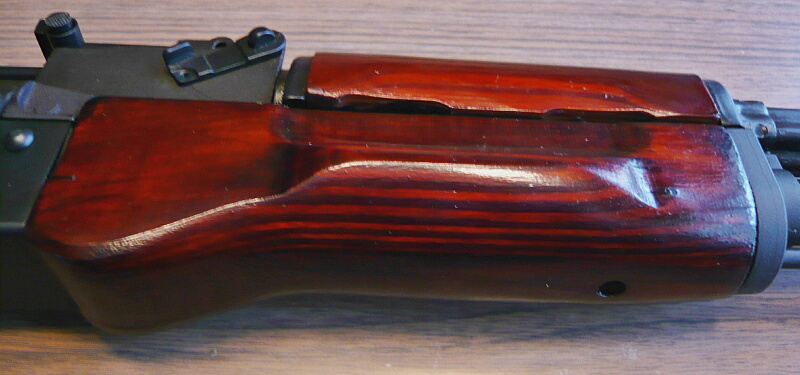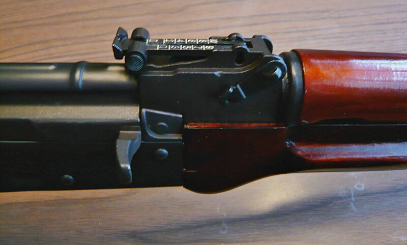 木製のハンドガード。木部はWEのドラグノフのような綺麗すぎる「家具調」ではなく、合板削り出しにニスをタップリ塗りたくった「らしい」造り。AKMからハンドガードの左右に膨らみが付けられており、握りやすくなっています。CYMAのAK47(マルイコピー)ではリヤサイトブロック右側のレバーは機能していませんでしたが、こちらはちゃんと回転させてハンドガード上側を外す事ができます。(その後、ハンドガード下側前端にあるレバーを操作して下側を外す事もできます)