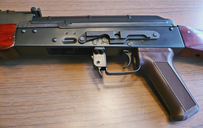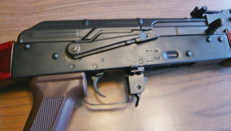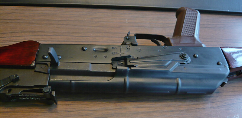 レシーバー右側。実銃AK47では手間の掛かっていた削り出しレシーバーをAKMにモデルチェンジの際にスチールプレス製にして生産性を高めたレシーバーが継承されています。青光りしたブルーイング仕上げで美しいのですが、惜しいかな実銃AK74は黒塗装仕上げ。