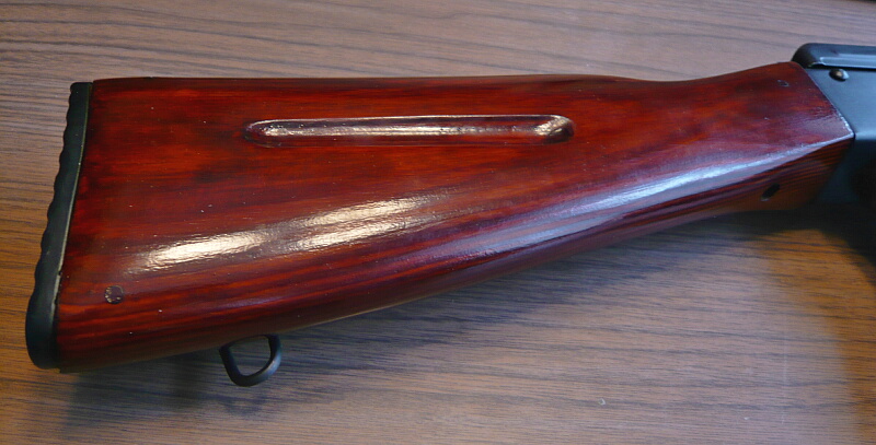 ストックは木製の固定ストック。AK47では下に傾いていたものがAKMで後方に真っ直ぐな形になり、AK74では同形状ですがAKMとの区別のために両側面に溝が掘られています。AK74後期型ではこげ茶色の樹脂製ストックに置き換えられ、AK74Mでは左側に折りたたむ機構が付加されて色も黒になります。