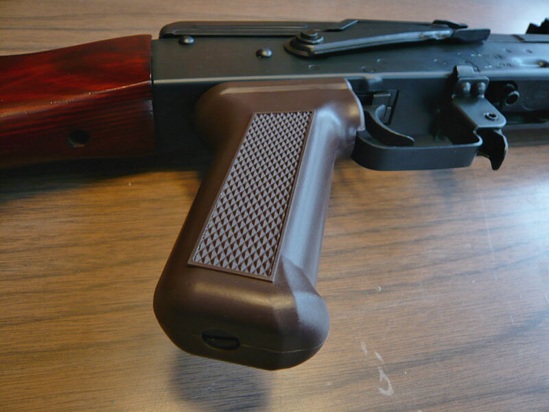 グリップは樹脂製。マルイのAKS74Uのものと同様の「74タイプ」で、内部にモーターが入るため少し太めになっているハズです。握り心地自体は良好ですが、ここは人によるところもあります。