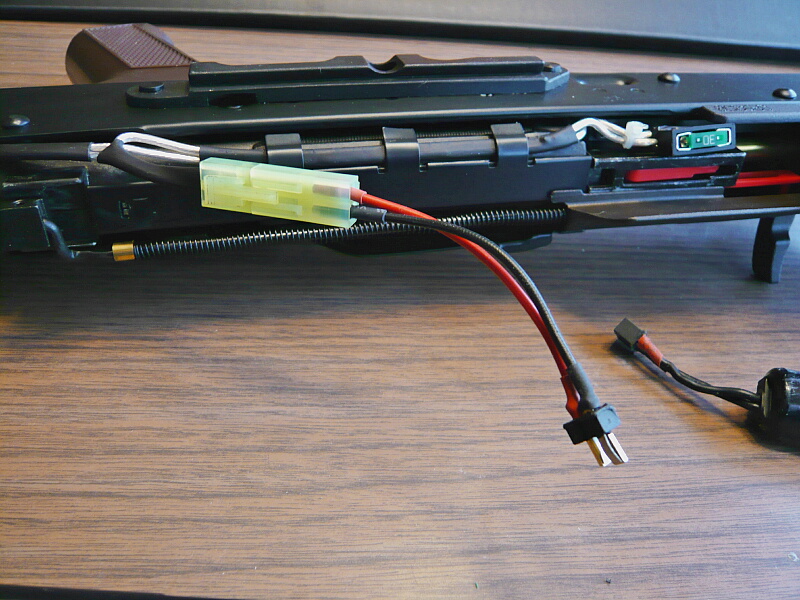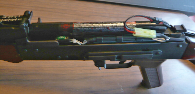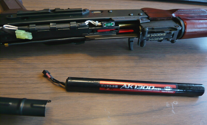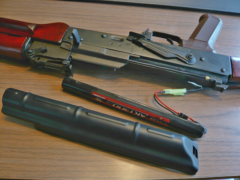 電動ガンなのでバッテリーを装着して発射準備に掛かりましょう。この銃は固定ストックですがバッテリ―はトップカバー内に入ります。