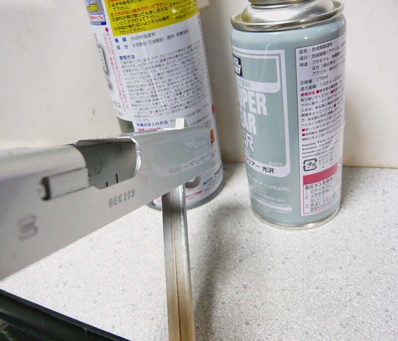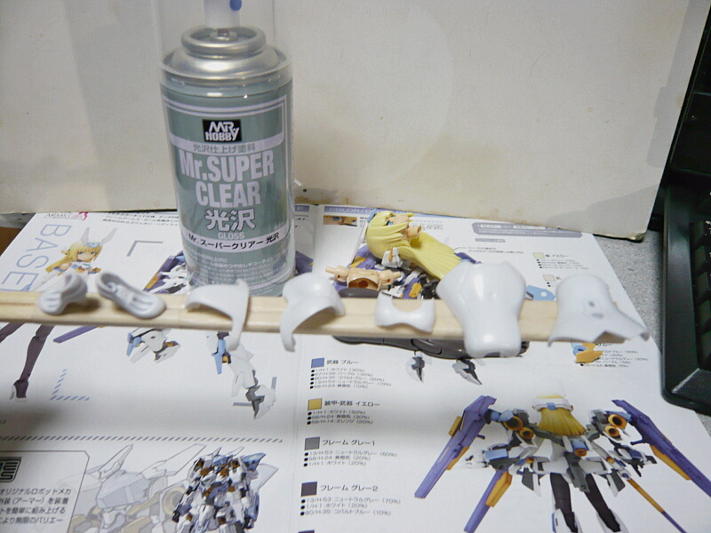 とりあえずクリアーを吹く前に乾燥を待ちます。今は9月の日中で気温は28℃ほど。30分ほど待ってクリアーを吹きます。クリアーはクレオスのMr.スーパークリアー光沢。