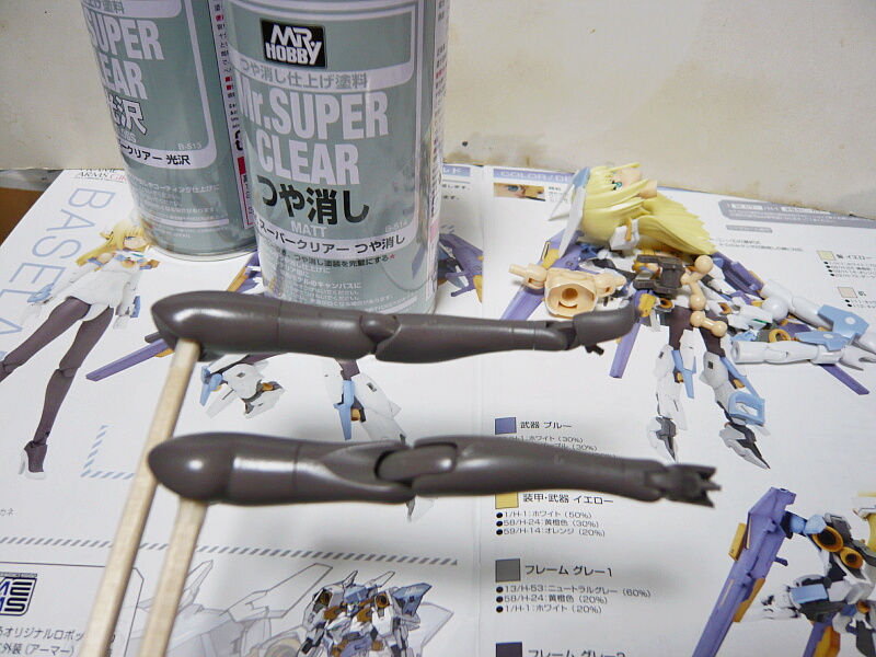 足は股関節のボールジョイントが刺さる部分に両面テープを巻いた割り箸を突っ込んで固定し、こちらはMr.スーパークリアーつや消しを吹きます。こちらも2回以上は吹いた方が望む風合いに近づくでしょう。