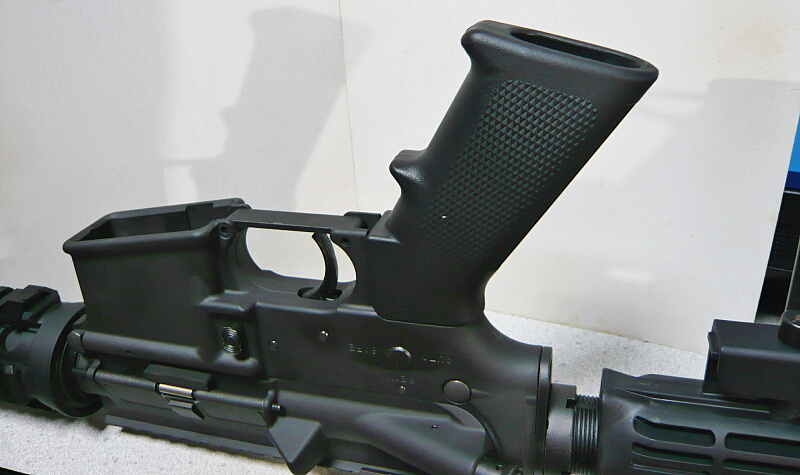 M4A1MWSのグリップは実銃サイズであり、電動ガンのM4系グリップは中にモーターが入る関係上、幅方向にかなり太くアレンジされています。しかしどちらかといえば車のハンドルも銃のグリップも細いのよりは太いのが好み。世間的には太い太いといわれるベレッタM92Fのグリップも、私には丁度いいくらい。特に長物で細いグリップだと右手の負担が大きく感じ、グリップを握った右手のみで保持していると早期に疲れてきてしまいます。