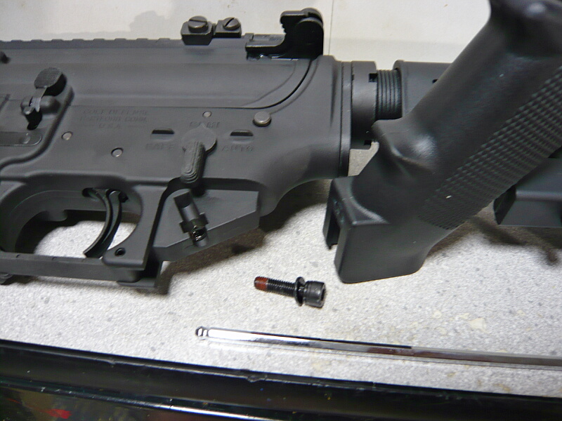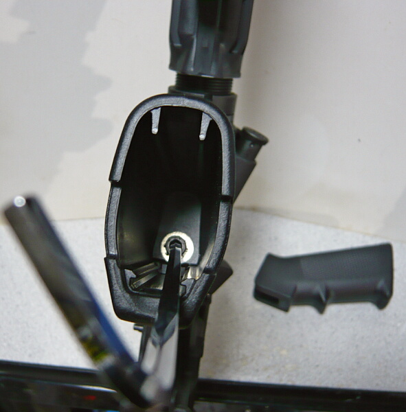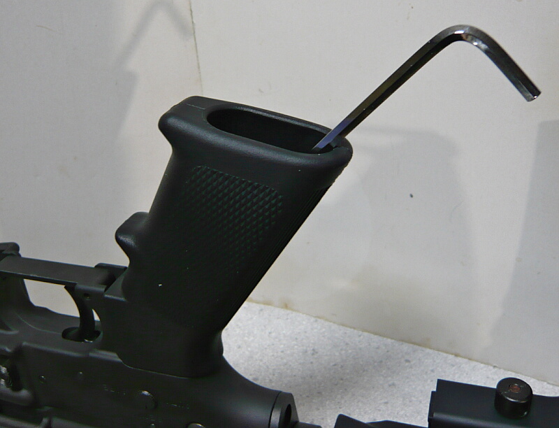 それでは取り付けに掛かりましょう。マルイM4A1MWSのグリップは実銃同様にグリップ内奥の1ヵ所のみでネジ留めされていますが、ネジはM4の六角ネジ。普通のLレンチでは届きません。